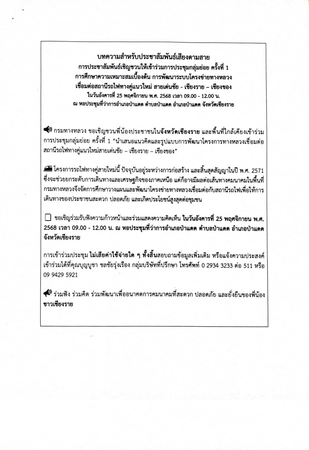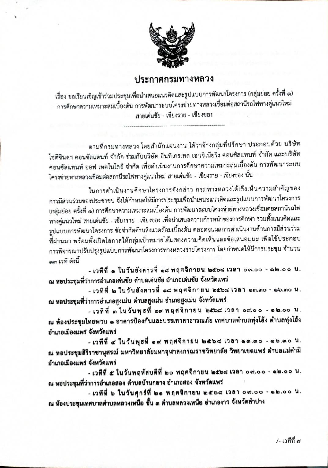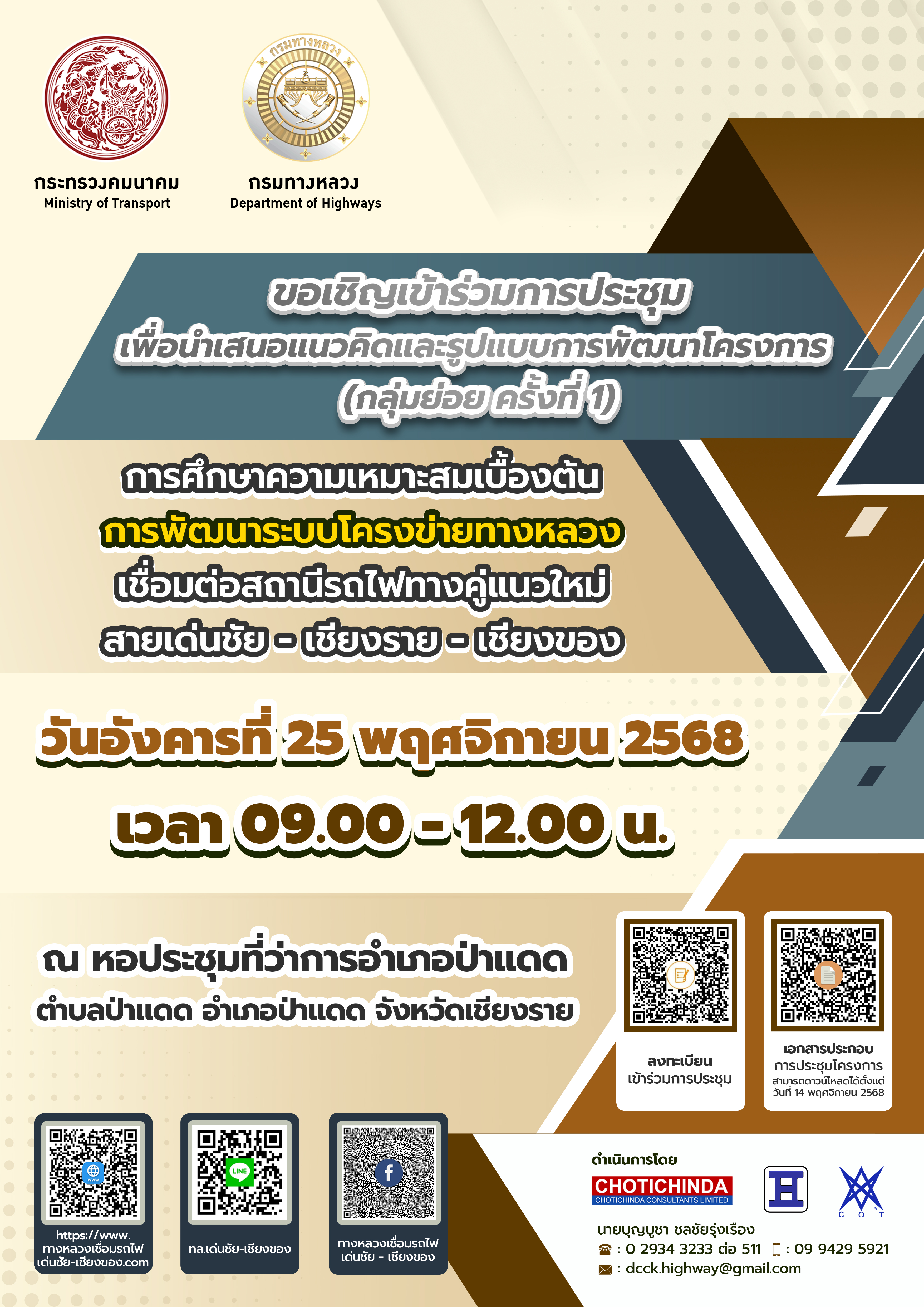 กรมทางหลวง ขอเชิญชวนพี่น้องประชาชนในจังหวัดเชียงรายและพื้นที่ใกล้เคียงเข้าร่วมการประชุมกลุ่มย่อย ครั้งที่ 1 "นำเสนอแนวคิดและรรูปแบบการพัฒนาโครงการทางหลวงเชื่อมต่อสถานีรถไฟทางคู่แนวใหม่ สายเด่นชัย-เชียงราย-เชียงของ